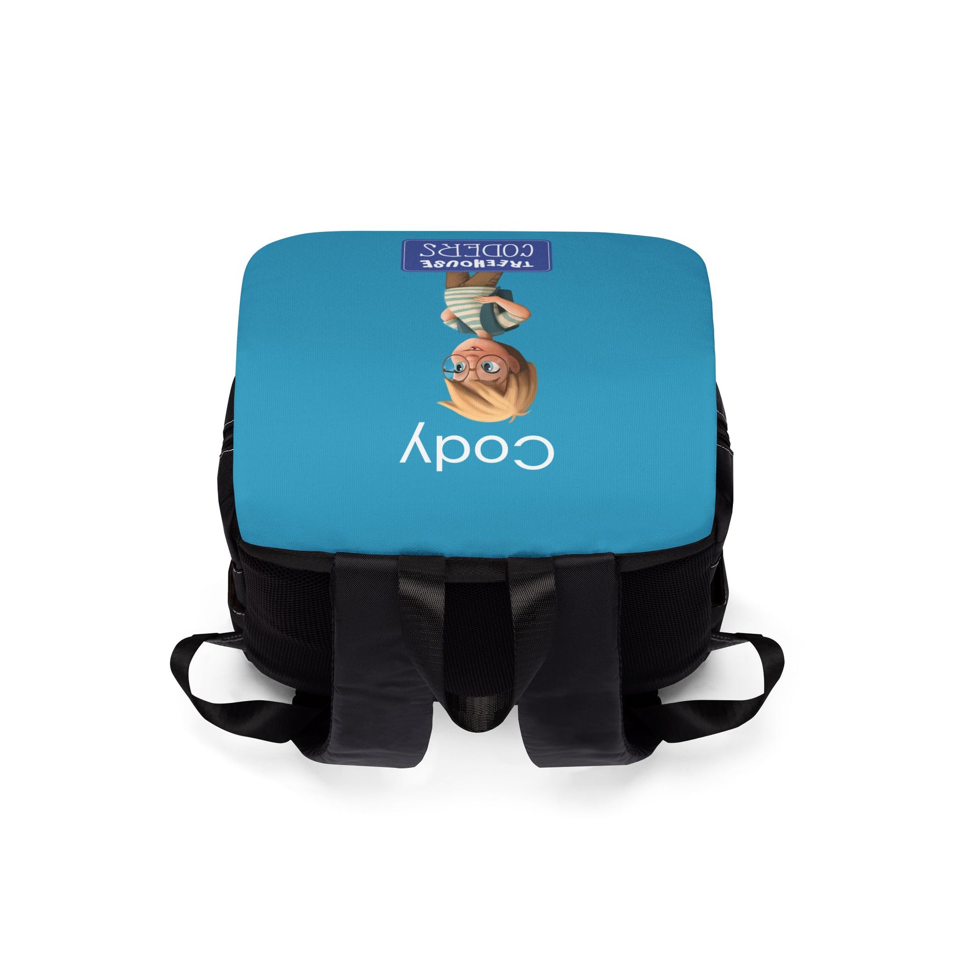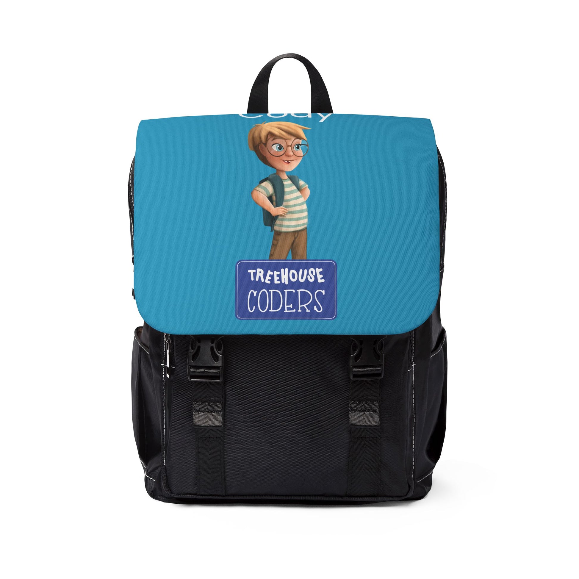 Carry your imagination with this Cody backpack! Featuring the creative tinkerer from Treehouse Coders. It is perfect for kids who love exploring, building, and tackling exciting projects with friends. It is made of durable Oxford canvas. It has two slip interior pockets and one laptop sleeve in the main compartment, a front zipper pocket, and two side pockets.