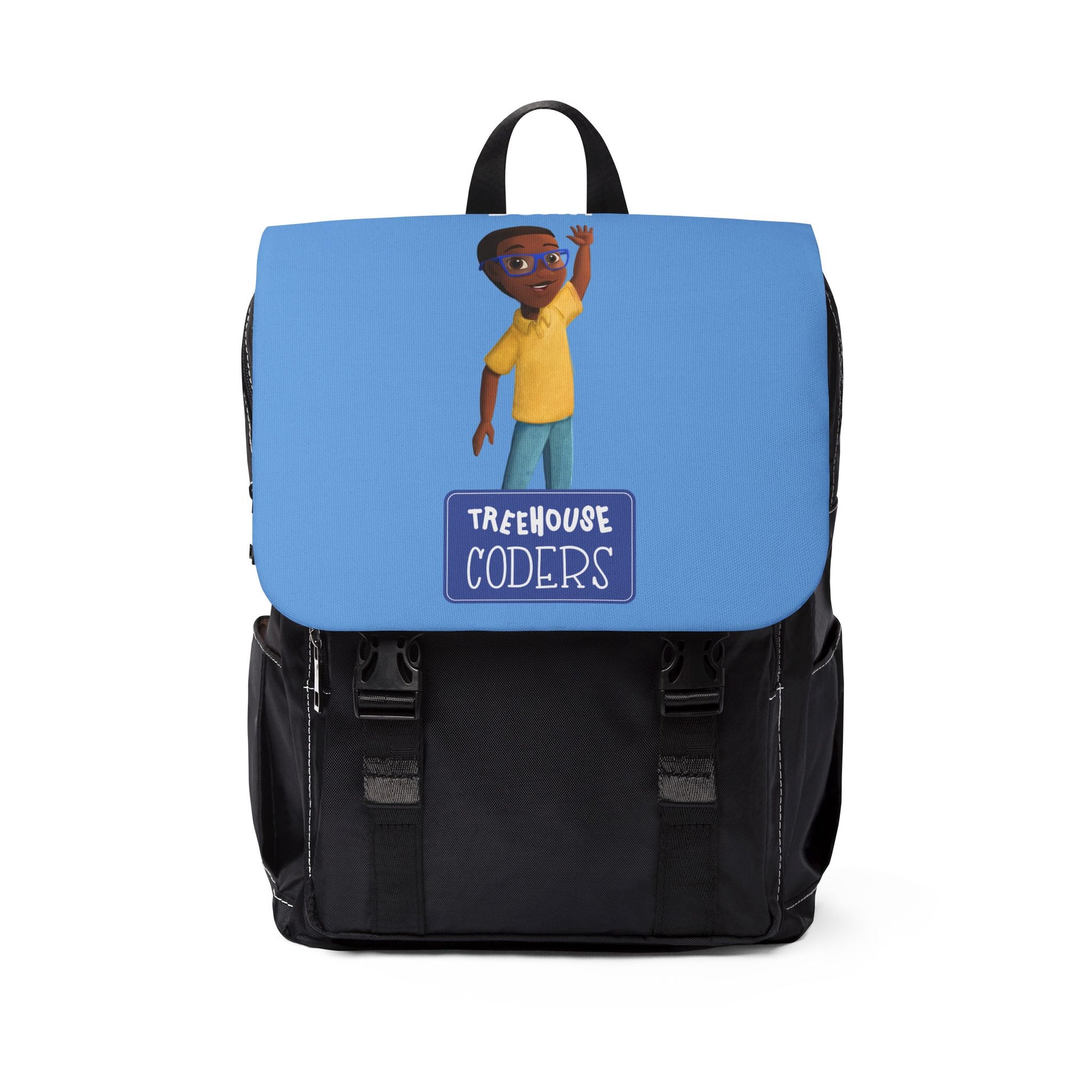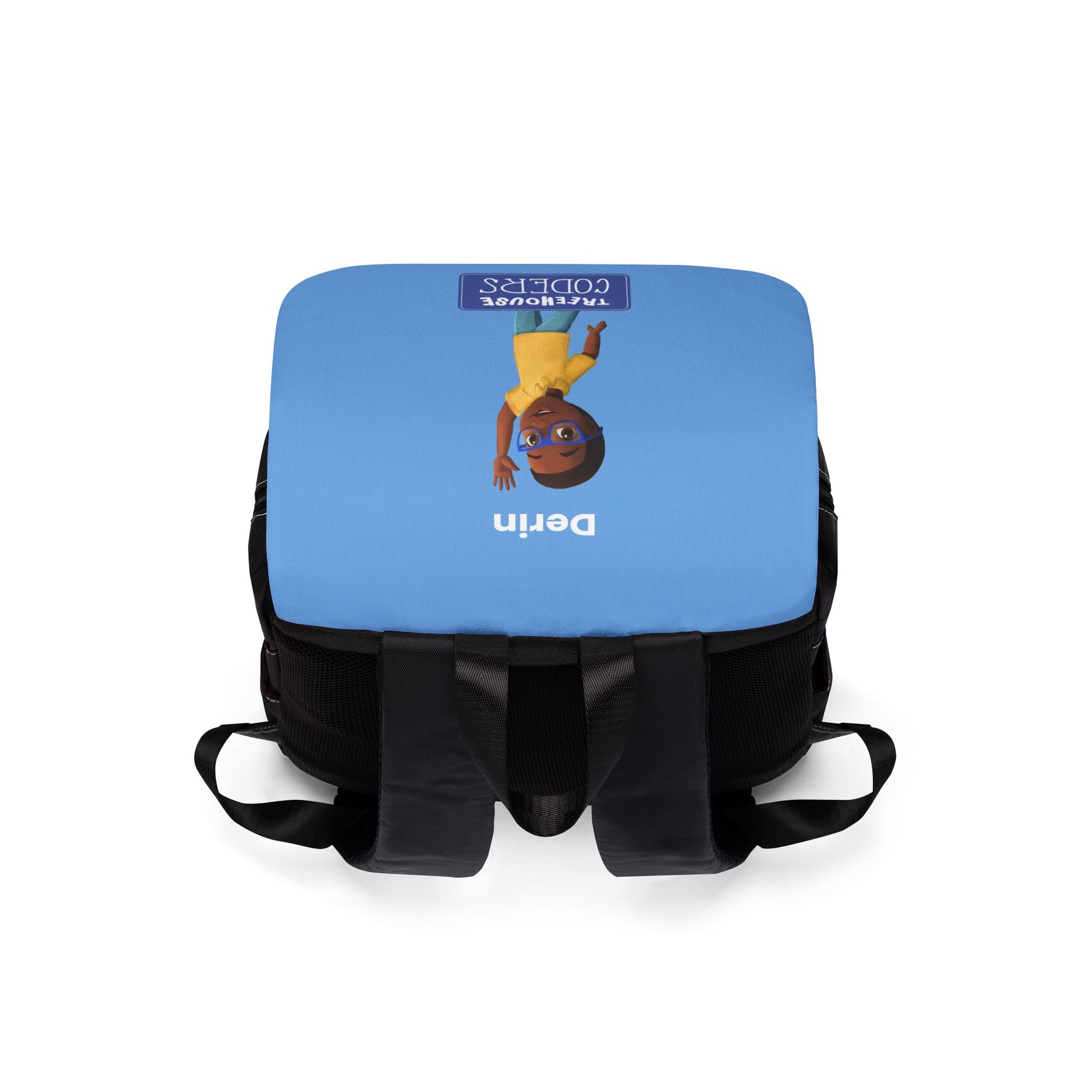 Casual Carry your adventure everywhere with this Derin backpack! Featuring the bold and creative leader of the Treehouse Coders. It is perfect for kids who love coding, exploring, and staying curious. It is also great for outdoor traveling. It is made of durable Oxford canvas. It has two slip interior pockets and one laptop sleeve in the main compartment, a front zipper pocket, and two side pockets.